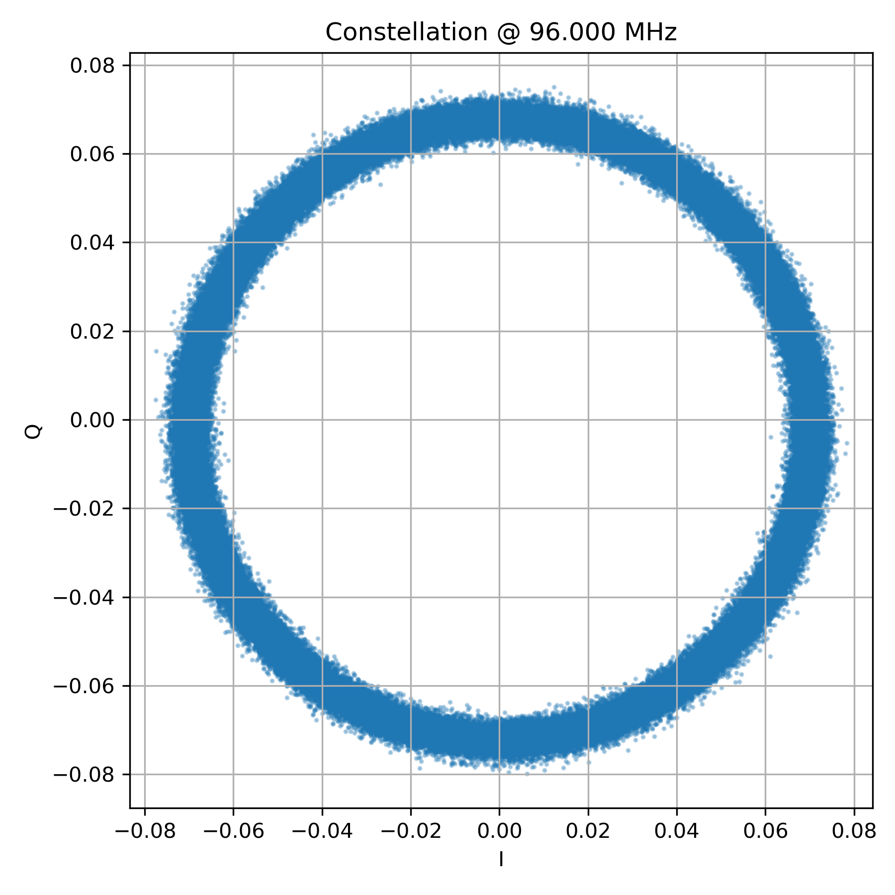 Broadcast FM is a good place to start because it produces one of the cleanest and most recognisable patterns in IQ space. A broadcast FM signal consists of a strong carrier whose frequency is varied by the audio, while its amplitude remains largely constant.