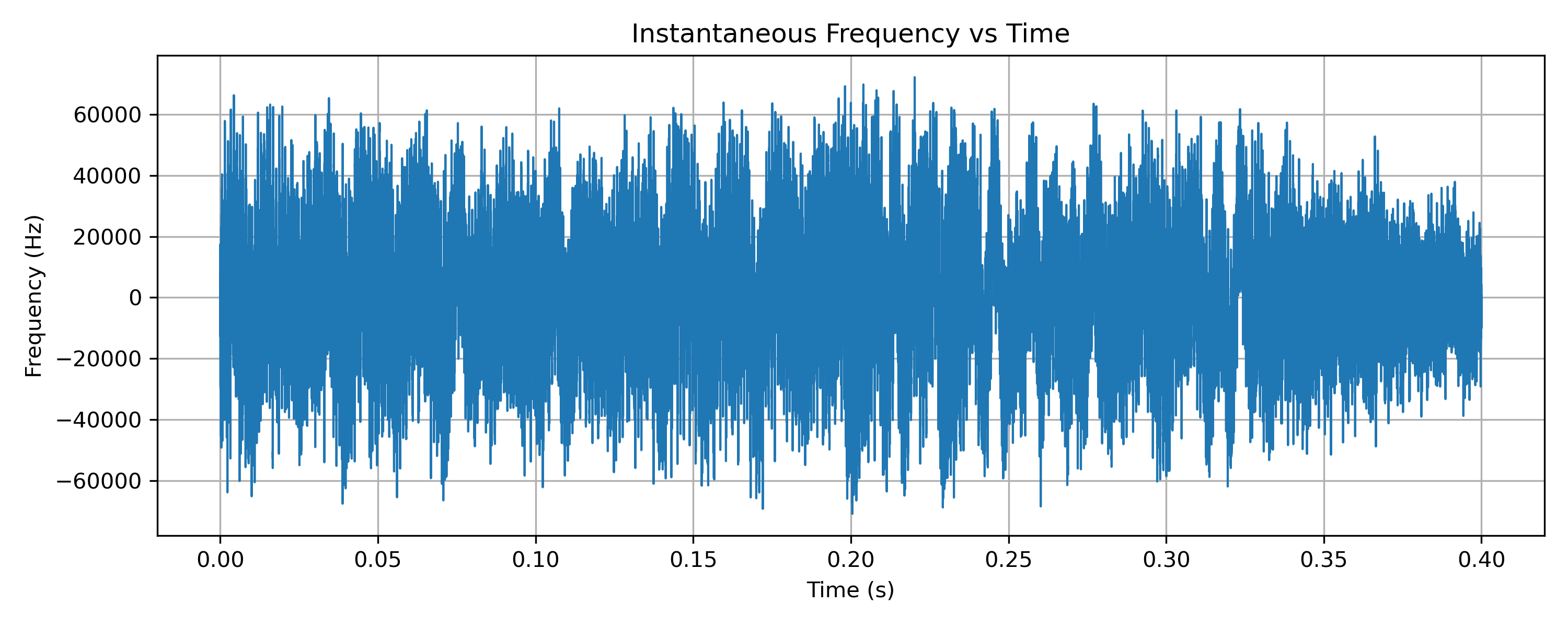 When instantaneous frequency is plotted (Figure 5), the audio content becomes immediately visible. Speech and music appear directly as deviations around the centre frequency. This plot makes explicit what FM is doing: audio is mapped onto frequency deviation.